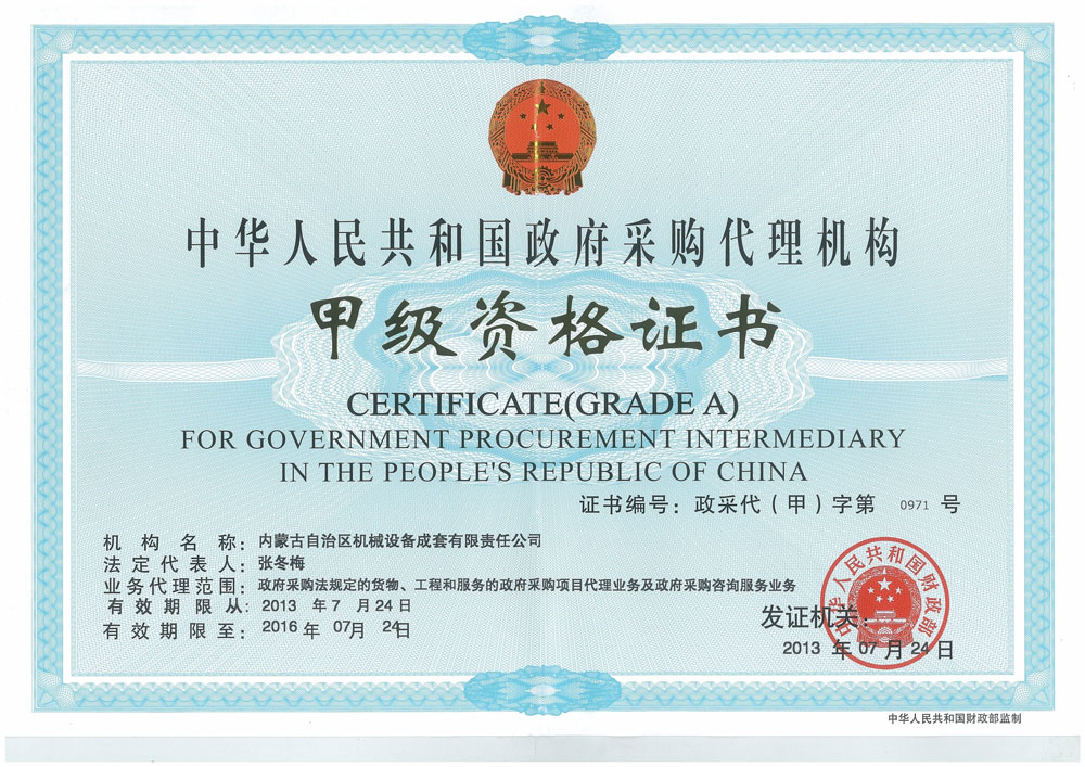 政府采購代理機構甲級資格證書